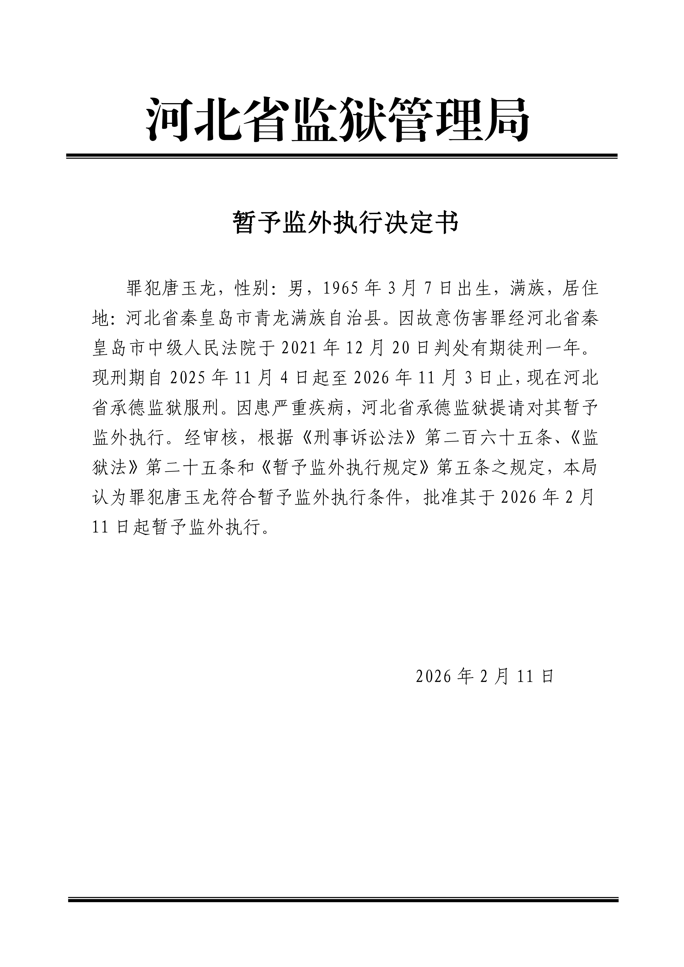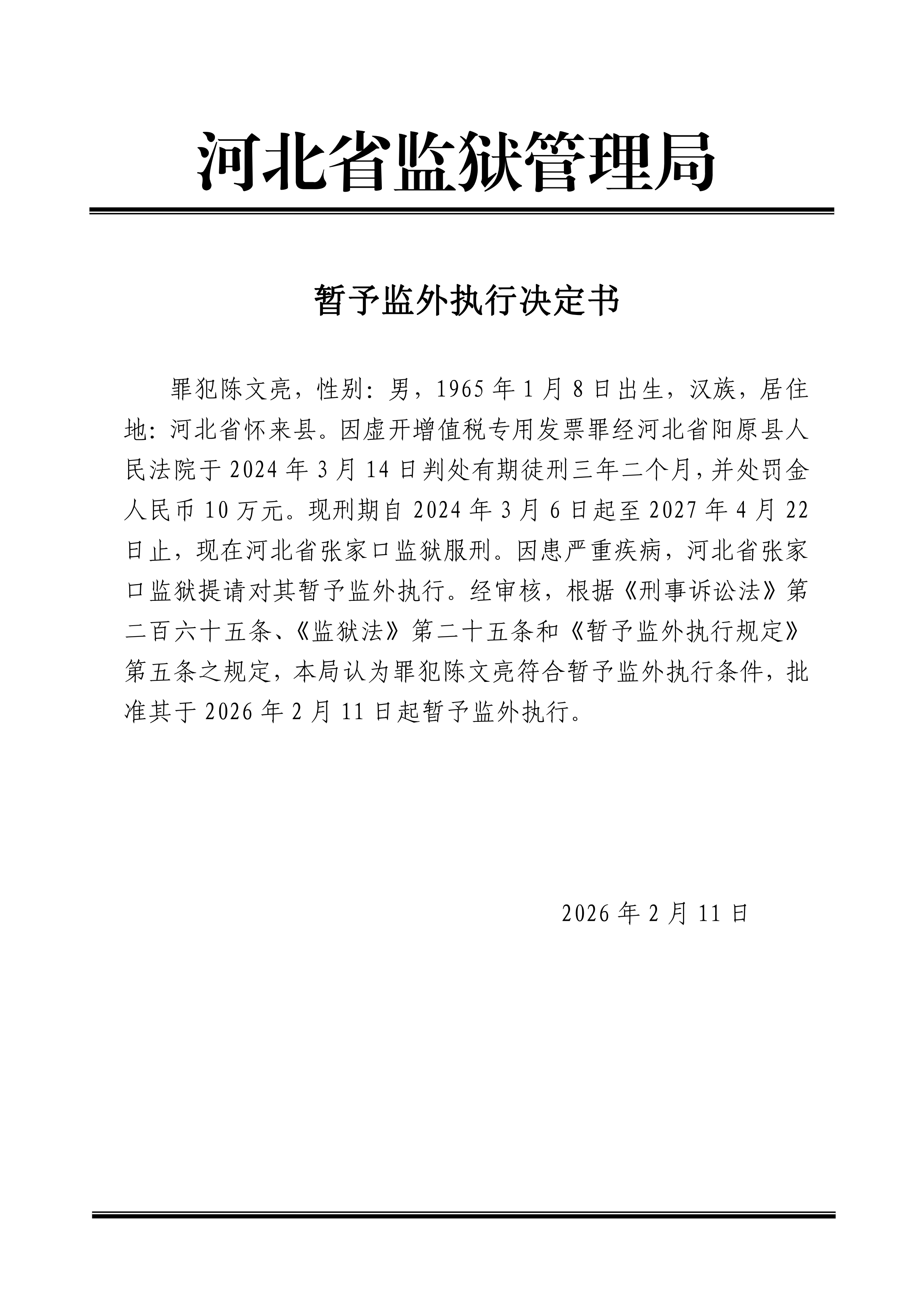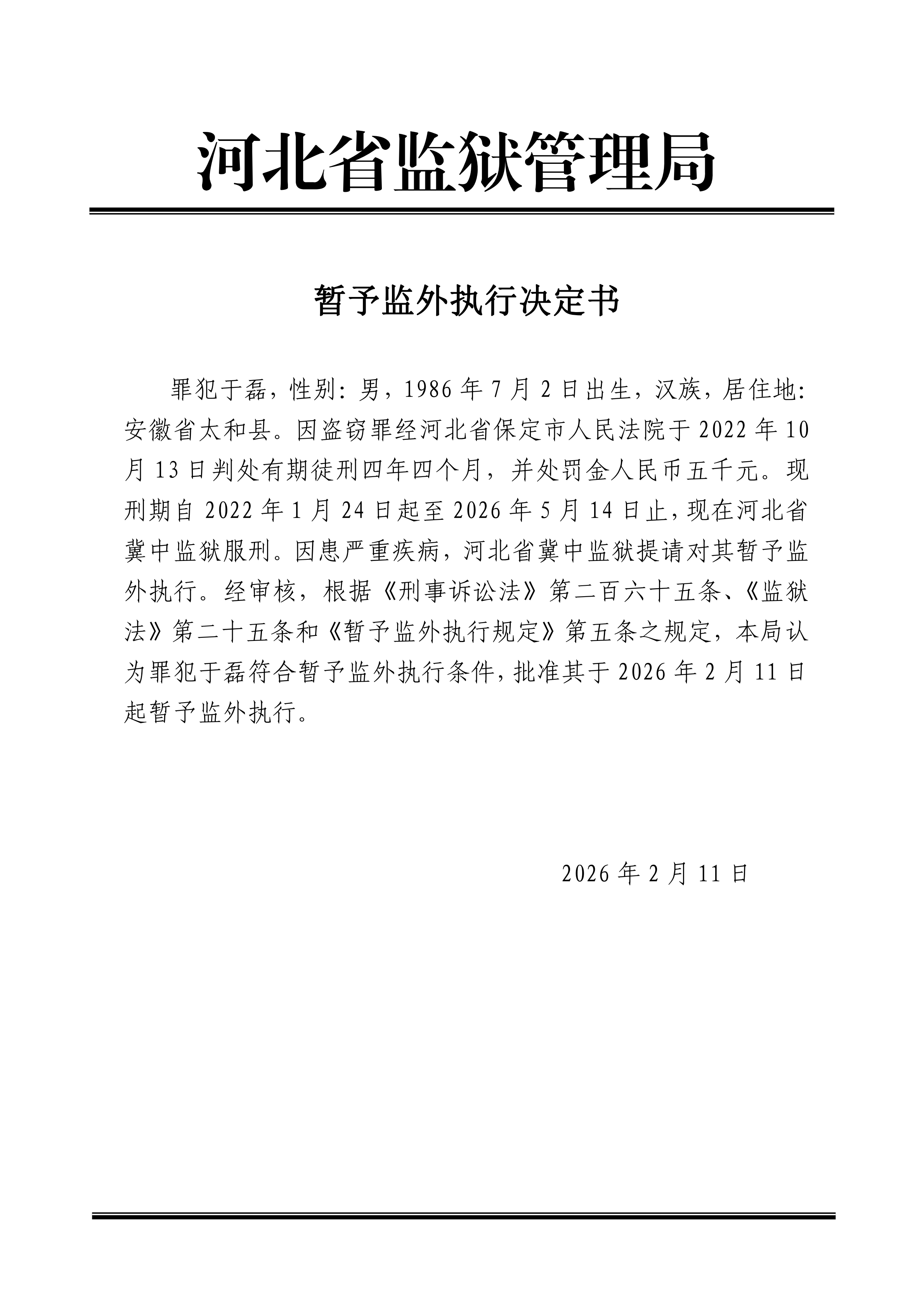 2026年2月河北省监狱管理局10名罪犯暂予监外执行决定书