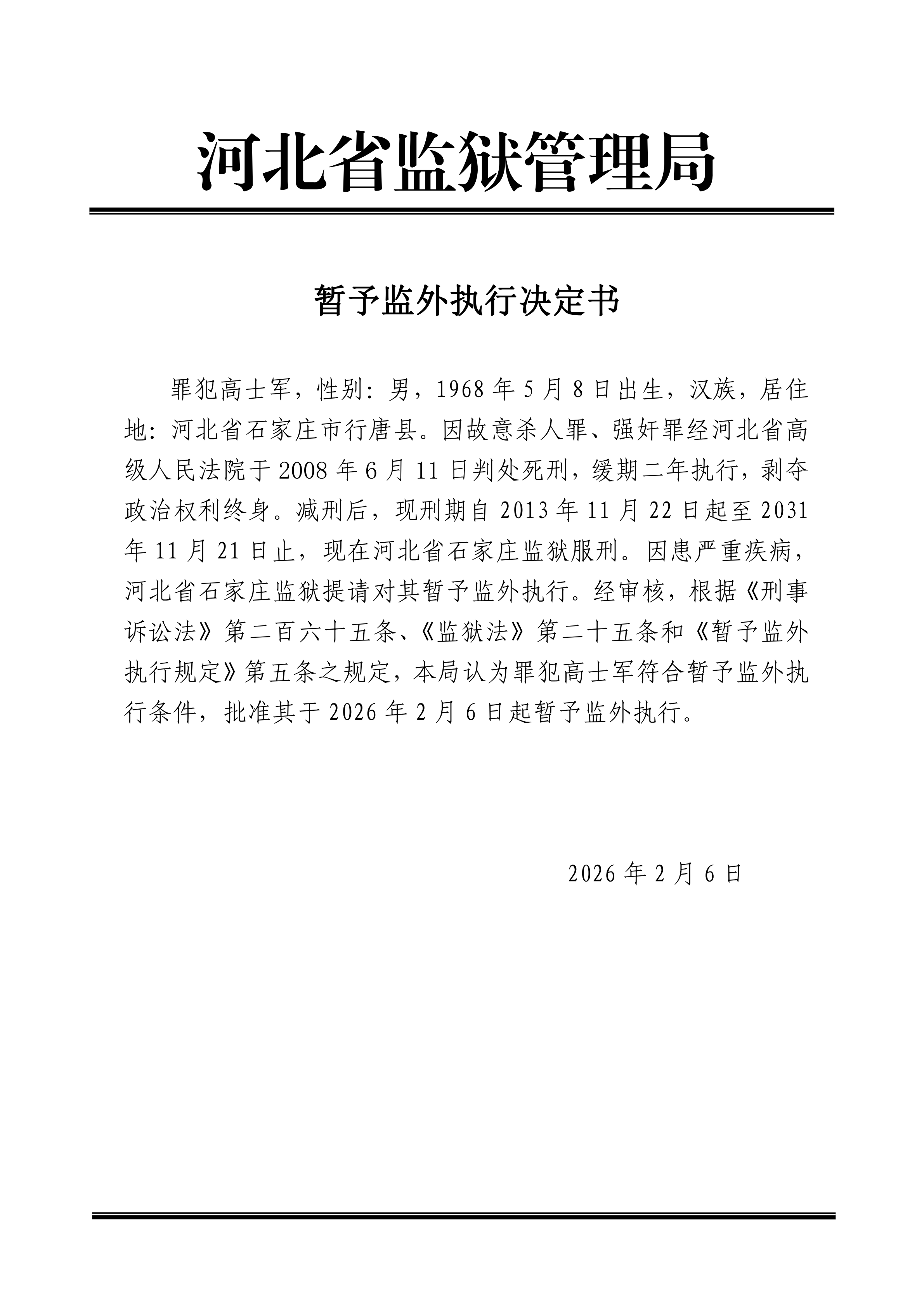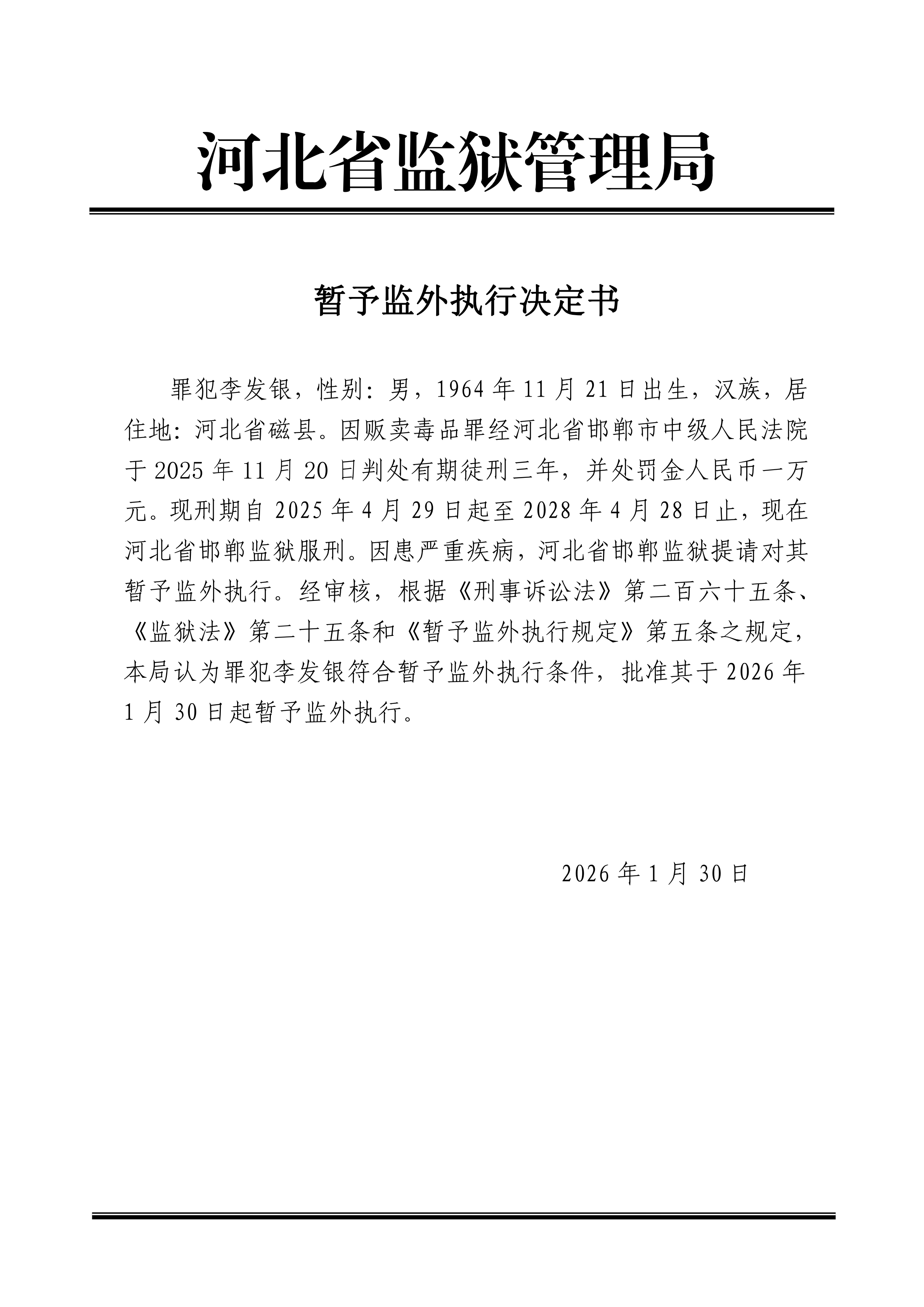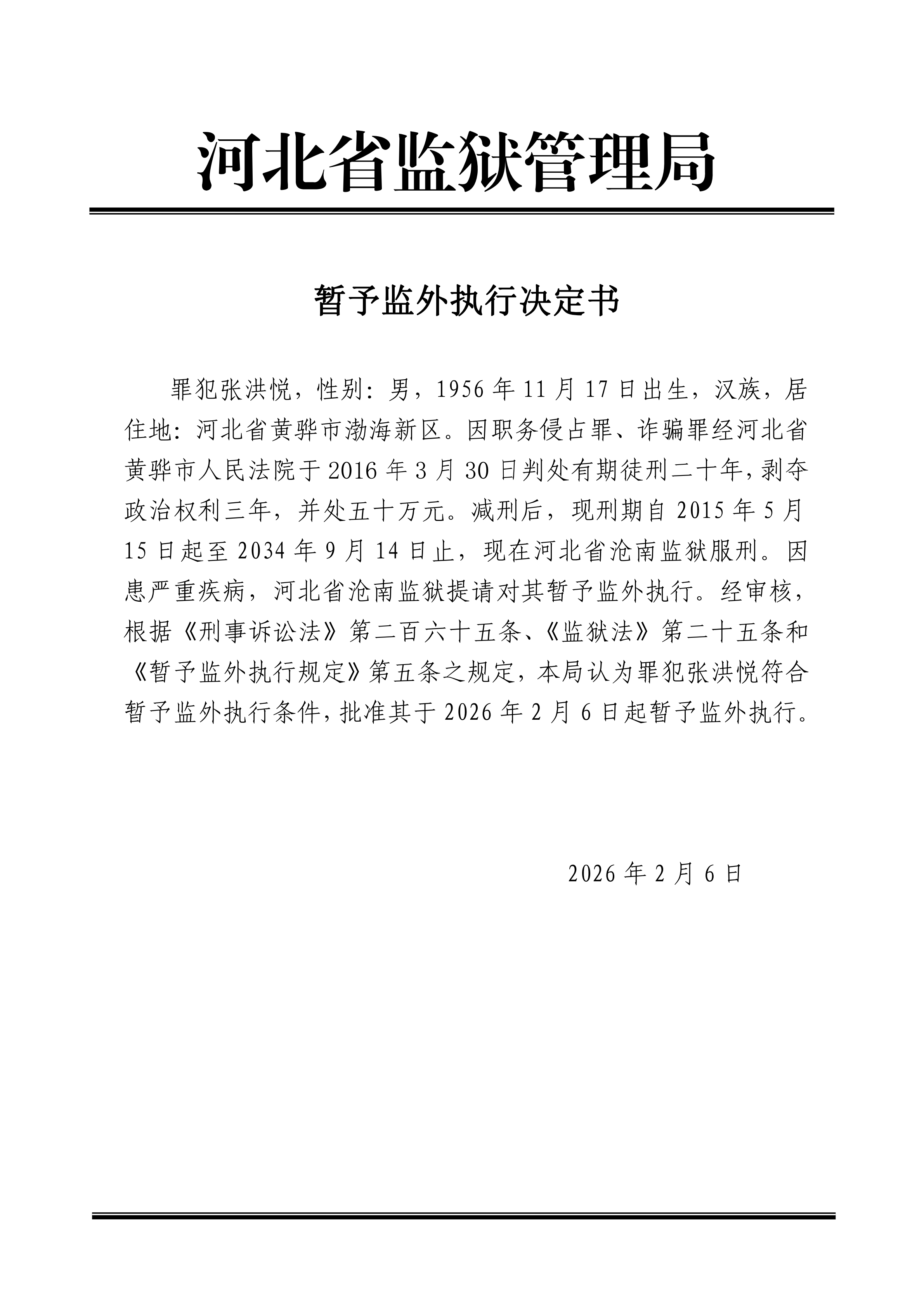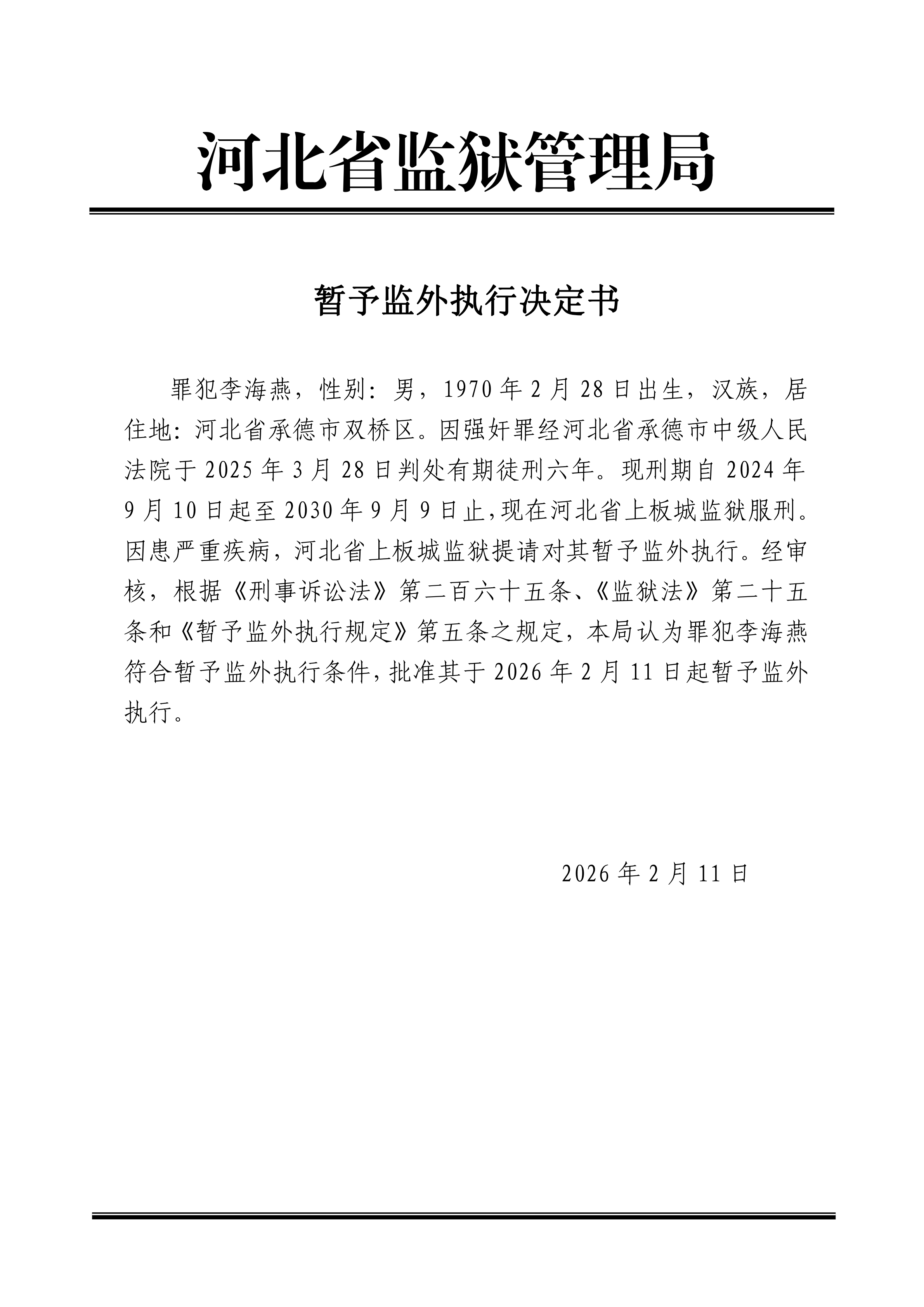2026年2月河北省监狱管理局10名罪犯暂予监外执行决定书